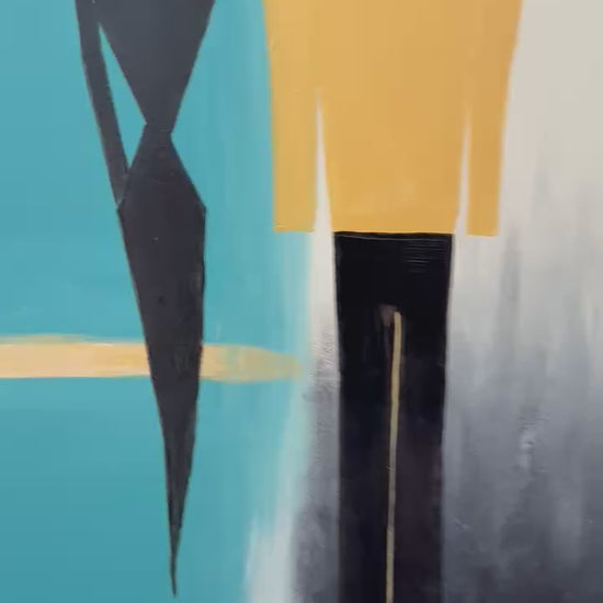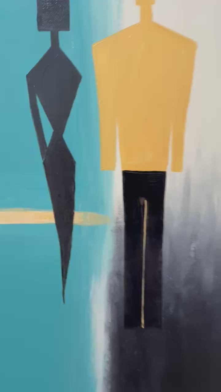 Painted in soothing teal, deep black, and warm neutral tones, the figures stand suspended in a moment of stillness—neither touching nor drifting apart. The blurred vertical divide symbolizes emotional barriers, healing, and the silent journeys we take toward understanding ourselves and others.