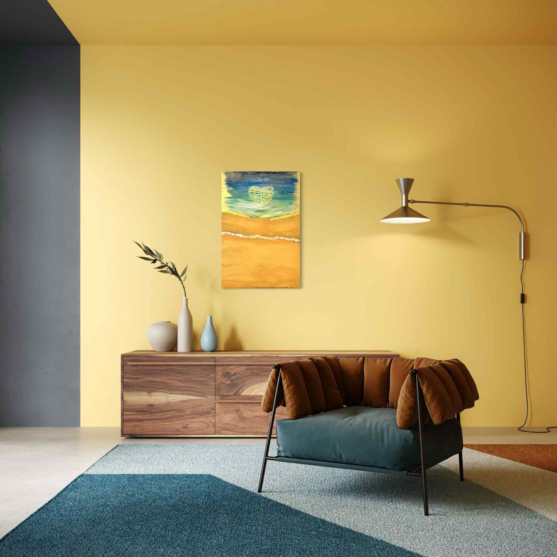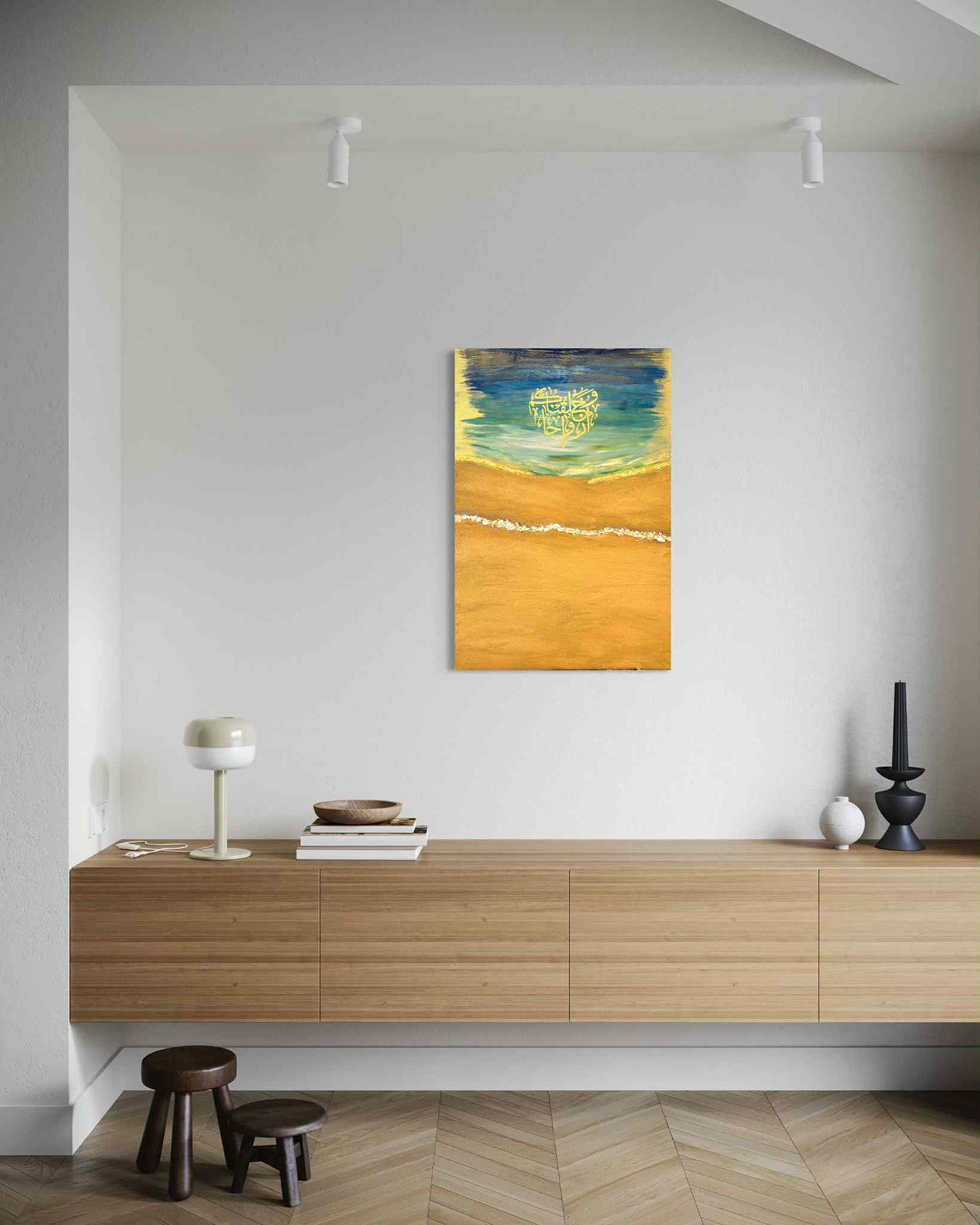Desert Horizon captures the meeting point between serenity and strength — where golden sands dissolve into deep blue skies and the horizon glows with divine light. Inspired by the timeless beauty of desert landscapes and the spiritual energy of renewal, this one-of-a-kind artwork embodies warmth, peace, and reflection — perfect for Eid and beyond.