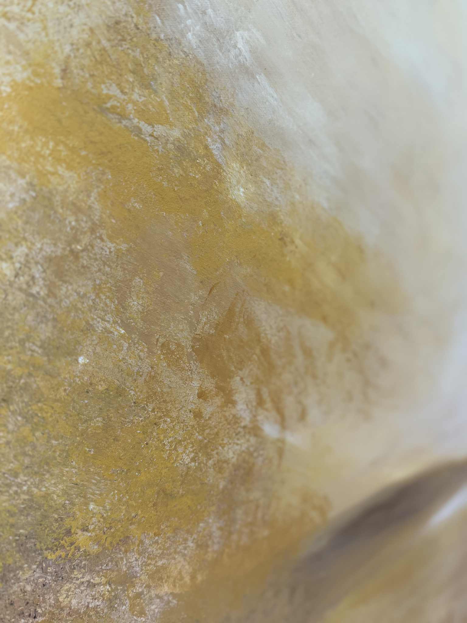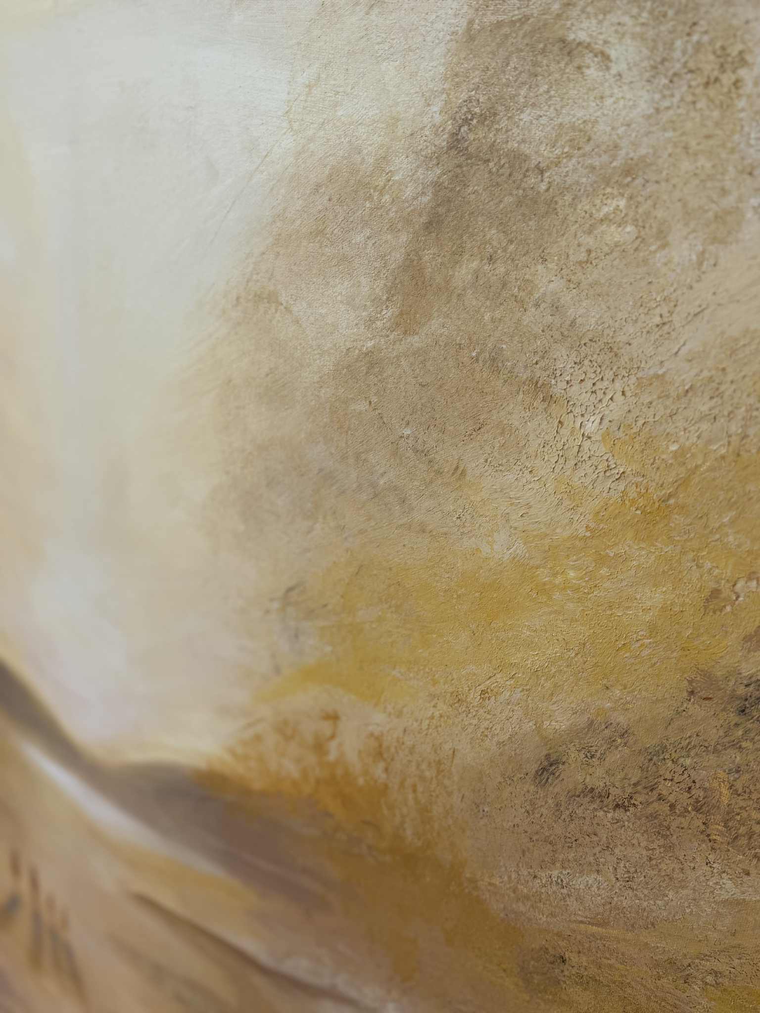 Path of Life is an abstract landscape that is both luminous and deeply personal. Inspired by my own family, the composition reveals four subtle figures — myself, my husband, and our two children — walking together through a golden world filled with light and possibility. The glowing horizon symbolizes hope and direction, a reminder that even in moments of uncertainty, there is always a path forward when we walk together.
